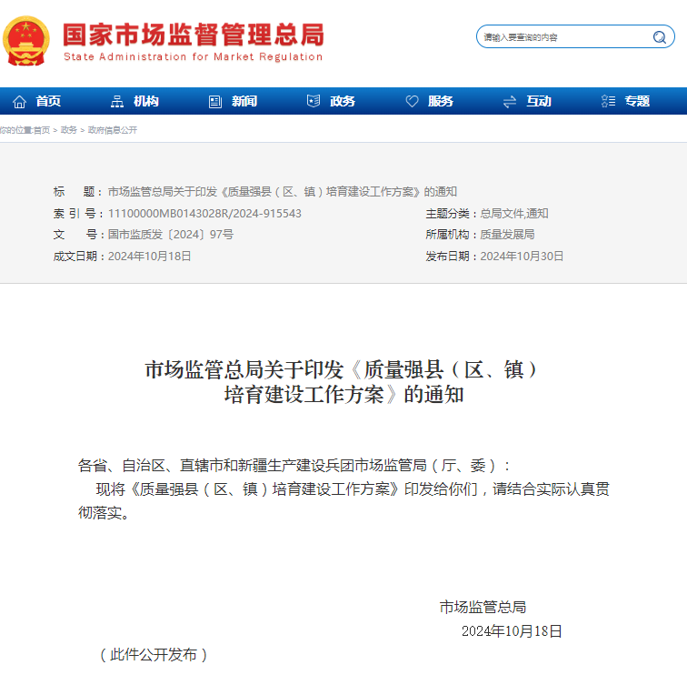 转载 | 市场监管总局关于印发《质量强县(区、镇)培育建设工作方案》的通知
